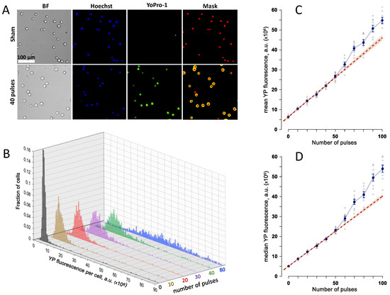 Quantification of cell membrane electropermeabilization by the uptake of Yo-Pro-1 (YP) dye. (A) Sample images of U937 cells after a sham exposure (control) and after a train of 40, 300-ns pulses at 7 kV/cm. BF, bright field; Hoechst, cell nuclei stained with Hoechst dye; Yo-Pro-1, dye fluorescence in electroporated cells; Mask, automated labeling of the nucleus and cell regions for measuring the integral YP fluorescence per cell. (B) The effect of the number of 300-ns, 7 kV/cm pulses on the frequency distribution of YP fluorescence in exposed cells. (C,D): The mean (C) and median (D) values of YP emission per cell, averaged across 4–7 independent experiments, for electroporation with different numbers of 300-ns, 7 kV/cm pulses. Error bars are the standard error. Dashed line is the best linear fit for the data between 0 and 50 pulses; the shaded area along the fit line is the 95% confidence interval. See text for more detail.