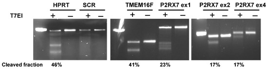 Targeted gene editing by CRISPR was validated in several selected KOs by a genomic cleavage detection assay. Target regions were amplified by PCR, to create heteroduplex DNA which was cut by a mismatch-specific endonuclease T7EI. Figure 2 illustrates the detection of cleaved DNA fragments by gel electrophoresis in KOs of hypoxantine phosphoribosyltransferase (HPRT), anoctamin 6 (TMEM16F), and purinergic receptor P2X7 (P2RX7) genes, but not in a sample transduced with scrambled gRNA (SCR, non-targeting gRNA). Cleaved segments were present in samples treated with the endonuclease (T7EI+ wells) but not in the negative controls (T7EI− wells). P2RX7 KOs were generated by a mixture of gRNAs targeting three different exons, which were amplified using respective primers and tested separately. The cleaved fraction reached close to 50%, which is the theoretical detection limit for this method.