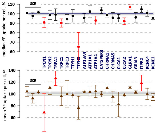 Data from a sample experiment comparing electroporation-induced YP uptake in different gene KO variants (labeled) and in control variants transduced with the non-targeting gRNA (“SCR”, the first three datapoints). YP uptake was measured 50 min after electroporation by a train of 20, 300-ns, 7 kV/cm pulses and plotted as a median (top graph) and mean YP fluorescence per cell. Error bars are the standard error from three independent experiments. Shaded areas are the standard error across the control samples. Datapoints with SSMD > 1 or SSMD < −1 are marked by red symbols. None of the KOs in this group showed statistically significant differences from the control using Dunnet’s test.