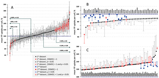 The effect of gene knock-outs on cell membrane permeabilization, as measured by YP dye entry following nsEP exposure. Graph show the mean value of YP uptake per cell (+/− s.e.) in % to control cells transduced with a scrambled gRNA. Datapoints marked by red color identify changes with SSMD > 1.0 or <−1.0. Open symbols mark statistically significant differences from the control at p < 0.05. (A): A total of 316 knockouts were sorted based on the YP uptake. Labels show the number of knockouts with increased and decreased YP uptake, in 10% steps. Note about a 3-fold larger number of knockouts which displayed the increased YP uptake. (B,C): The end regions of the graph from (A) with gene names added. The panels also show the data from replication sets of experiments (square symbols). See text for more details.