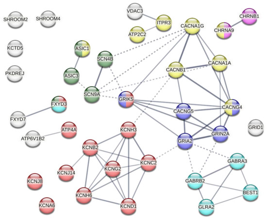 The families of genes whose knock-outs led to a significant increase in YP uptake following electroporation with nsEP. The protein–protein interactions were categorized by STRING database v. 11.5 at the confidence level of 0.5. Colors identify proteins related to Ca2+ (yellow), K+ (red), Na+ (green), or Cl− transport (cyan). Blue and magenta colors are for proteins related to the glutamate and acetylcholine receptor complexes, respectively.
