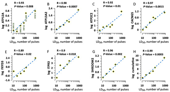 An increased electroporative YP uptake in a gene KO means that the missing or altered protein helped the membrane stability or repair in the wild-type variant. Then, one can expect that at least some of these proteins contribute to cell survival after nsEP treatments, such as tissue and tumor ablation. The sensitivity of different types of cells to nsEP depends on specific pulse parameters and varies in very wide ranges [37,38,39]. For example, the lethal dose of 300-ns pulses that killed 50% of cells (LD50) in six different human cell types differed as much as 80-fold [39]. However, cellular mechanisms underlying the different sensitivity remain unclear. Using the Genevestigator database [40], we extracted the expression levels of 60 genes whose KOs resulted in higher YP uptake, and compared them across the six cell types with known LD50 [39]. When the difference in the expression levels of an individual gene was plotted against the respective LD50, we found a strong (R ≥ 0.9) and highly significant (p ≤ 0.02) correlation for eight of the checked gens (Figure 6A–G). Pooling together the expression levels for these genes yields a nearly perfect correlation with LD50 (R = 0.986, p = 0.0003, Figure 6H). We infer that comparing the expression levels of these genes could be a method to predict the sensitivity of different cell types to nsEP, as well as the selectivity and efficiency of nsEP ablation treatments.