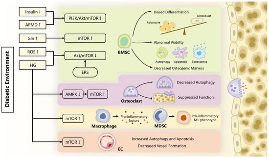 It has been shown that the high glucose-mediated mTOR phosphorylation in bone marrow-derived macrophages resulted in a senescent phenotype and upregulation of pro-inflammatory factors, ultimately exacerbating macrophage inflammation and periodontal bone destruction []. In addition, hyperglycemia was also demonstrated to promote macrophage pyroptosis and pro-inflammatory factor secretion by activating mTOR/4EBP1 and decreasing downstream ULK1 activity and autophagy flux, which in turn, aggravates alveolar bone resorption in periodontitis []. On the contrary, activation of the mTOR/AKT pathway inhibited pro-inflammatory factor production in hyperglycemic bone marrow-derived macrophages []. The conflicting results might be attributed to the different sources of macrophages. Moreover, the mTOR pathway regulates the responses of myeloid-derived suppressor cells (MDSCs), which restrict immune responses in bone repair []. High glucose promoted the differentiation of bone marrow-derived MDSCs into pro-inflammatory M1 macrophages, stimulating the accumulation of abnormal MDSCs in bone tissue []. This interference of immunosuppression depends on mTOR activation with phosphorylation of 4EBP1 and S6K1 and could be reversed by an mTOR kinase inhibitor []. Since M1 macrophage could inhibit osteoblastogenesis and facilitate apoptosis of MSCs [,], diabetes-stimulated M1 macrophage differentiation might be responsible for impaired bone defect regeneration in hyperglycemia. Hence, mTOR seems to positively regulate inflammatory responses in bone tissue and aggravate diabetes-induced bone metabolic aberrations.