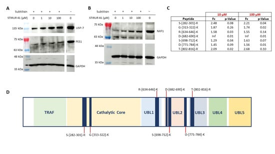 Validation of DARTS results for USP-7, PES1 (A), and NXF1 (B). (C) Peptides mapping for USP-7 regions involved in the binding with STIRUR 41, reported with the corresponding fold changes and p-Values. (D) USP-7 2D representation, showing the protein’s different domains in different colors and STIRUR 41 protected peptides as blue bars.