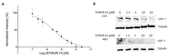 (A) IC50 curve of USP-7 inhibition by STIRUR 41, obtained through GraphPad Prism 7. Each data point is represented with the relative standard deviations. (B) Western Blot showing USP-7 protein levels in HTLA-230 cells treated (or not) with increasing amounts of STIRUR 41 at 24 h and 48 h. Tubulin was exploited as a loading normalizer.