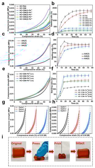 3.4. Analysis of Compression Properties of HC-CSN-Fe3+ Hydrogels