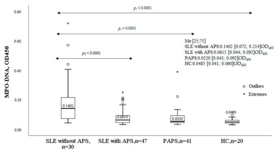 The levels of the MPO-DNA complex significantly differed in the studied groups compared to controls (Figure 1). In patients with SLE without APS, the MPO-DNA complex was significantly higher compared to patients with SLE with APS, patients with PAPS, and healthy controls (HC). The levels of the MPO-DNA complex were comparable between patients with SLE and APS, patients with PAPS, and healthy controls.