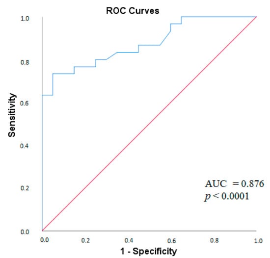 To assess the ability of the MPO-DNA complex to differentiate patients with SLE without APS from healthy donors, ROC analysis was performed. According to ROC analysis, the AUC for the MPO-DNA complex was 0.876 (p < 0.0001). The value of the MPO-DNA complex at the cut-off value of 0.058 with a sensitivity of 80% and a specificity of 74.5% allows differentiating SLE patients without APS from healthy controls (Figure 2).