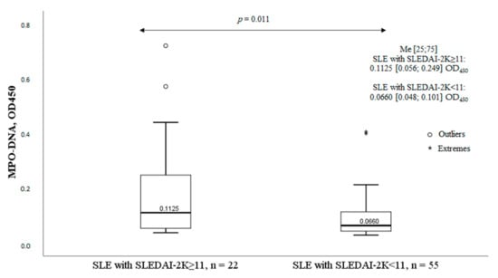 SLE patients (n = 77) were divided into two groups depending on SLE activity according to SLEDAI-2K: group I (SLEDAI 2K ≥ 11 points) included 22 patients with high disease activity, and group II (SLEDAI 2K < 11 points) included 55 patients with moderate or low SLE activity. The MPO-DNA complex levels were significantly higher in patients of Group I with high disease activity compared with patients of Group II (Figure 3).