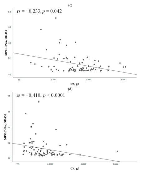 Correlations of the MPO-DNA complex levels with some clinical and laboratory manifestations of SLE. Note: (a) Correlation of the MPO-DNA complex with the SLEDAI-2K index (n = 77); (b) Correlation of the MPO-DNA complex with antibodies to dsDNA (n = 77); (c) Correlation of the MPO-DNA complex with C3 (n = 77); (d) Correlation of the MPO-DNA complex with C4 (n = 77). MPO-DNA complex, myeloperoxidase-deoxyribonucleic acid complex; SLE, systemic lupus erythematosus; SLEDAI-2K, Systemic Lupus Erythematosus Disease Activity Index; anti-dsDNA, anti-double-stranded DNA; rs, Spearman’s rank correlation coefficient; p, probability.