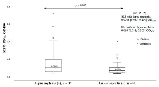 Lupus nephritis is one of the most severe and prognostically unfavorable manifestations of SLE. The pathogenesis of renal damage is associated with the deposition of immune complexes, which leads to the activation of the complement system and the attraction of inflammatory cells, including neutrophils, to the renal glomeruli [22]. It was found that patients with SLE and glomerulonephritis had significantly higher serum MPO-DNA complex levels (Figure 5). The data obtained partially agree with the results of other researchers. As in the present work, Bruschi et al. [14] found that in patients with SLE, the levels of the MPO-DNA complex were significantly higher in patients with lupus nephritis compared to those without renal involvement. Hakkim et al. [17] studied the ability of the serum of SLE patients to degrade NETs. They found that patients with SLE who had reduced NETs elimination and, accordingly, higher levels of NETs in the blood were more likely to have lupus nephritis. Interestingly, the authors found deposition of NETs in the renal glomeruli in an SLE patient with decreased NETs degradation. Leffler et al. [18] also found an association between impaired NETs elimination and lupus nephritis in SLE. Moreover, class IV lupus nephritis was significantly more frequent in the group of patients with decreased NETs degradation. A prospective study by Leffler et al. [19] demonstrated that a reduced NET degradation ability in SLE patients was associated with the presence of markers of active lupus nephritis, such as proteinuria, cellular casts, and leukocyturia. Zhang et al. [20] studied nonspecific markers of NETs in SLE. The authors found that the levels of circulated cell-free DNA (cfDNA) were significantly higher in patients with lupus nephritis compared to those without renal damage. The levels of cfDNA were particularly high in patients with active lupus nephritis, which correlated directly with daily proteinuria and inversely with endogenous creatinine clearance. Although the study by El-Ghoneimy et al. [16] found no significant difference in NETs levels between patients with and without lupus nephritis, patients with a higher renal SLEDAI had significantly higher NETs levels that correlated with the levels of daily proteinuria. There are also opposite results regarding NETs and lupus nephritis in SLE [13,15]. Van der Linden et al. [15] studied the ability of neutrophils to produce NETs under the influence of plasma of SLE patients. The authors found no correlation between the increased release of NETs and lupus nephritis. The study by Hanata et al. [13] also found no relationship between the MPO-DNA complex and lupus nephritis. Hanata et al. suggested that their results were related to the features of the cohort they studied: most patients had the “inflammatory” phenotype of SLE with fever; serositis; arthritis; myositis; and, less often, lupus nephritis. In the present work, 48.1% of patients with SLE had lupus nephritis, more in line with patient characteristics in other similar studies [14,17,18,20], where there was a sufficient number of patients with lupus nephritis and an association between renal disease and elevated NETs levels. Villanueva et al. [22] conducted an interesting study. They analyzed renal biopsy specimens from nine SLE patients with lupus nephritis. In the morphological study of the kidneys, NETs were found in 67% of cases. Moreover, the percentage of glomeruli infiltrated with NETs was higher in patients with grade IV lupus nephritis and/or a higher biopsy activity index. In addition, patients with NETs in the glomeruli had, on average, higher serum levels of antibodies to dsDNA than patients without NETs in the glomeruli.