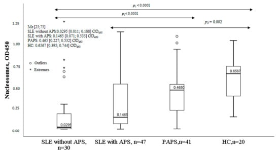 The concentration of nucleosomes was significantly lower in the group of SLE patients without APS compared to controls and patients with PAPS. The nucleosome levels were also lower in the SLE with the APS group compared to controls and PAPS. Nucleosome levels in the group of patients with PAPS did not differ significantly from healthy controls (Figure 6).