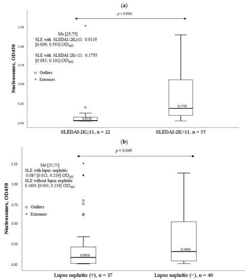 Nucleosomes are another potential marker of NETosis. According to different authors [26,27,28], nucleosome levels are elevated in SLE patients, which may be associated with increased lymphocyte apoptosis or NETosis. However, in the present work, the opposite results were obtained. Significantly, lower levels of nucleosomes were observed in patients with SLE compared to healthy controls. Moreover, in this work, lower nucleosome values were associated with high SLE activity, the presence of glomerulonephritis, and arthritis.