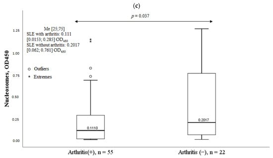 Nucleosomes in some clinical manifestations of systemic lupus erythematosus. Note: (a). Nucleosomes according to SLE activity; (b). Nucleosomes in lupus nephritis; (c). Nucleosomes in arthritis; SLEDAI-2K, Systemic Lupus Erythematosus Disease Activity Index; OD, optical density; Me, median with an interquartile range; p, probability.