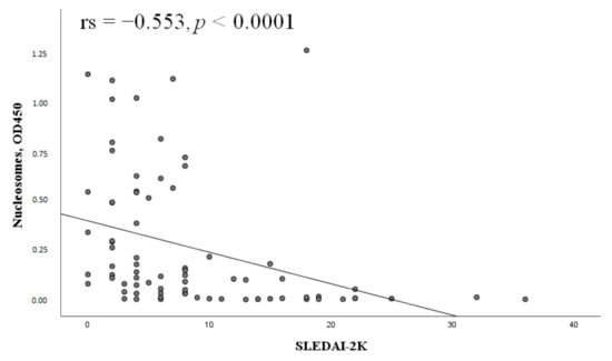 Nucleosome levels negatively correlated with SLEDAI-2K (Figure 8).