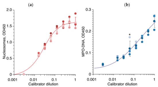 ELISA calibration curves of the nucleosomes (a) and MPO-DNA (b) are shown by red and blue lines, respectively. Serial dilutions of the DNA-Histone-Complex standard (Roche, Cell Death Detection ELISA PLUS) were used as a positive control (1:2, 1:4, 1:8, 1:16, 1:32, 1:64, 1:128, 1:333) on each 96-well plate. Individual values from each plate (n = 4), as well as average and standard deviation, are shown by dots and bars, respectively. Asterisk denotes outlier value.