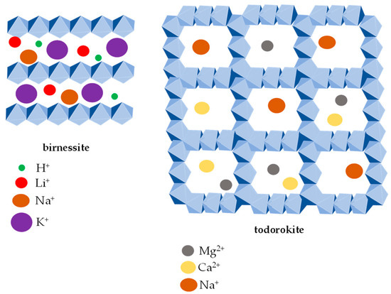 Manganese oxides with the layered structure consist of MnO6 octahedron-based layers, and birnessite (Figure 1) is a typical representative. Depending on the degree of hydration and the cations’ size, the layered structures may expand or collapse. The typical dimensions of the interlayer spaces are 7 or 10 Å. While the Ca(II), Mg(II), Ni(II) and Cu(II) cations stabilize the structure of 10 Å phyllomanganates, the H(I), K(I), Pb(II), Ce(III) and Th(IV) cations stimulate the collapse of the crystal structure [48]. However, manganese with a tunnel structure (e.g., todorokite) (Figure 1) does not collapse or expand [49].