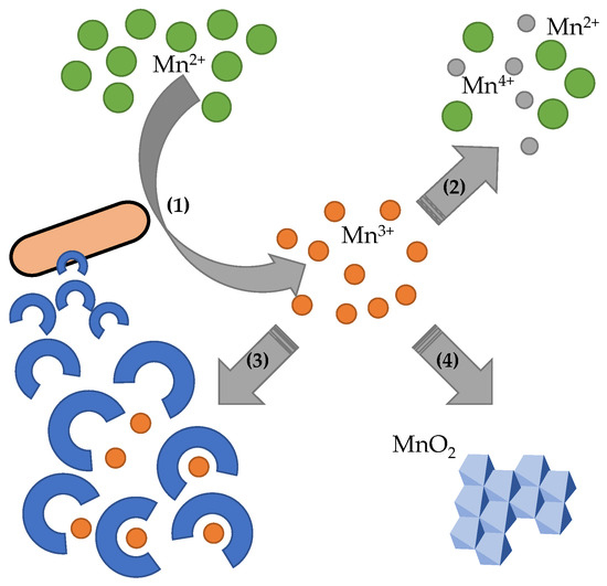 Microorganisms are capable of modifying and maintaining the distinctive pH [57], and redox conditions [58,59] in their microenvironment due to their metabolic [60] and enzymatic activities [61], which enables the processes of manganese-bearing minerals’ and dissolved species’ transformations. These include (i) the oxidation of dissolved Mn(II) that results in the precipitation of Mn(III), Mn(IV) or mixed-valence oxides, (ii) the reduction of insoluble manganese oxides into the mobilizable Mn(II), and (iii) the chelation of dissolved Mn(II) with organic exudates that triggers the formation of biogenic minerals [62,63,64,65]. Furthermore, some microorganisms can oxidize and reduce manganese simultaneously, e.g., Bacillus pumilus and B. cereus [66].