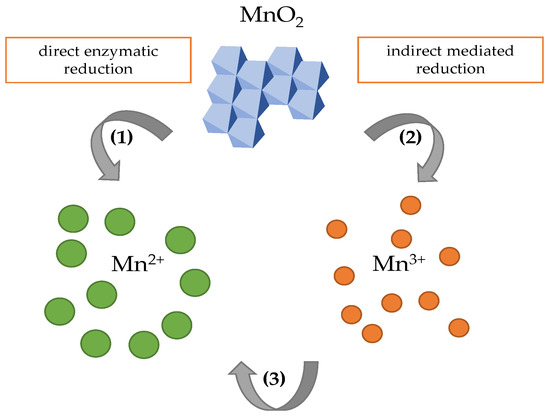 The mechanism of biocatalyzed reduction of Mn(IV) is considered as a one-step process where two electrons are transferred, and the final product of the reaction is Mn(II) [16]. The indirect reduction by reducing agents [108] is considered a two-step process where the transfer of one electron to MnO2 takes place, and the metastable intermediate product of Mn(III) is formed (Figure 4) [109].