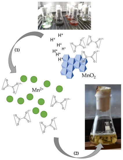 Since acidolysis can be an alternative or co-occurring pathway of manganese oxides’ deterioration [131], the acidification of culture media facilitates the manganese oxides’ dissolution [17]. Still, acidification is only partially responsible for the manganese bioextraction and plays a secondary role compared to reductive dissolution [128]. Godunov, et al. [132] also reported that the diluted sulfuric acid solutions were not capable of dissolving Mn2O3 and Mn3O4 completely. This is due to the formation of the thermodynamically stable MnO2 on the surfaces of the initial oxides (Equations (2) and (3)). However, if oxalate (Equation (4)) is supplemented to the sulfuric acid solution, the dissolution rate is considerably accelerated [133].