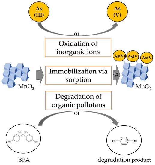 Manganese oxides have also shown great potential to remediate sites contaminated with inorganic substances, e.g., the labile and toxic As(III) can be oxidized to a more stable and less toxic As(V) in their presence. The kinetics of As(III) oxidation under natural conditions are very slow and it can take several months for As(III) to be oxidized completely. However, manganese oxides can decrease the oxidation half-life of As(III) oxidation to 10–20 min (Figure 6) [152], which seems beneficial for the ecosystem. On the other hand, the oxidation of inorganic metals or metalloids by manganese oxides can also have adverse effects on the environment. This is the case with chromium, which is more toxic in its hexavalent form. Therefore, reducing Cr(VI) to Cr(III) is preferential in the remediation processes. However, it was reported that Cr(III) is susceptible to oxidation and form Cr(VI) in the presence of birnessite [153], thus, manganese oxides are not utilizable in the remediation of media contaminated with Cr(VI).