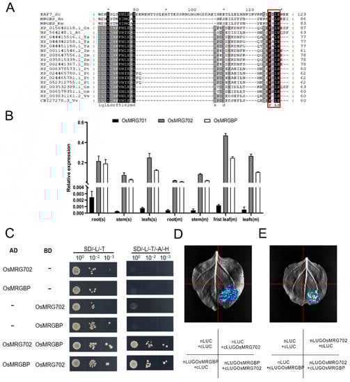 OsMRG702 interacts with OsMRGBP. (A) Alignment of full-length sequences of MRGBP proteins from human (Hs), mouse (Mm), Oryza sativa L. (Os), Arabidopsis thaliana (At), Triticum aestivum L. (Ta), Zea mays L. (Zm), Sorghum Moench (Sb), Populus trichocarpa (Pt), Glycine max (Gm), Vitis vinifera (Vv), in which the conserved FxLP motif is highlighted by red box. Amino acid sequence numbers are marked by * and numbers. (B) Relative expression levels of OsMRG701, OsMRG702, and OsMRGBP in different rice tissues. s, seedlings. m, mature plants. (C) The Y2H assay to validate OsMRG702 interacting with OsMRGBP. (D,E) LCA to verify the interaction between OsMRG702 and OsMRGBP in vivo.