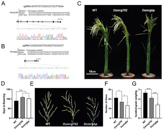 We chose the rice variety Zhonghua 11 (ZH11) as the main material in this study for its high Agrobacterium-mediated transformation efficiency and that it is adapted to planting in Nanjing []. OsMRG702 knockdown rice showed a relatively late flowering phenotype in the study of OsMRG702 RNAi in the similar Nipponbare variety []. To further test whether OsMRGBP is also participating in flowering-time regulation in rice as OsMRG702, the CRISPR/Cas9 technology was applied to obtain Osmrgbp and Osmrg702 mutants for analysis. The first exon of each gene was picked as the target region to design sgRNAs (Figure 2A,B). After resistance screening and sequencing, several mutants were obtained, lines containing one base insertion at the exons in OsMRG702 and OsMRGBP among the mutants were picked out and named as Osmrg702 and Osmrgbp (Figure S2A,B and Figure 2A,B). The Osmrg702 and Osmrgbp mutants flowered around 11–18 days later than that of WT under natural long-day (NLD) conditions in the field (Figure 2C,D). The rachis branches of Osmrgbp and Osmrg702 were fewer than the wild-type (Figure 2E). To test whether the Osmrg702 and Osmrgbp mutation affects grain yield and yield components, we evaluated the agronomic traits, including several tillers and hundred-grain weight in WT, Osmrg702, and Osmrgbp grown in the paddy field under NLD conditions. The number of tillers and hundred-grain weight in both mutants were decreased compared with these of WT and the defects in Osmrgbp are relatively severe (Figure 2F,G).
