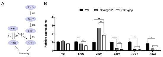 Multiple flowering regulatory genes are down-regulated in the mutants. (A) Schematic of core flowering regulatory pathways in rice. (B) Relative transcript levels of flowering regulatory genes in the WT, Osmrg702, and Osmrgbp plants. The relative expression levels of Hd3a were indicated by the right Y-axis while the rest tested genes were indicated by the left Y-axis. Asterisks indicate statistically significant differences in Student’s t-tests. * means p < 0.05, ** means p < 0.01, *** means p < 0.001, **** means p < 0.0001.