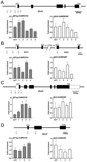 OsMRG702 and OsMRGBP enrichment at the loci of key flowering genes. OsMRG702 and OsMRGBP enrichment at the Ehd1 (A), RFT1 and Hd3a (B), Ehd3 (C), and Ghd7 (D) loci were analyzed with ChIP-qPCR. The enrichment on the OsACTIN-2 (ACT) locus was normalized to 1. Asterisks indicate statistically significant differences of Student’s t-test between the tested loci and ACT. * means p < 0.05.