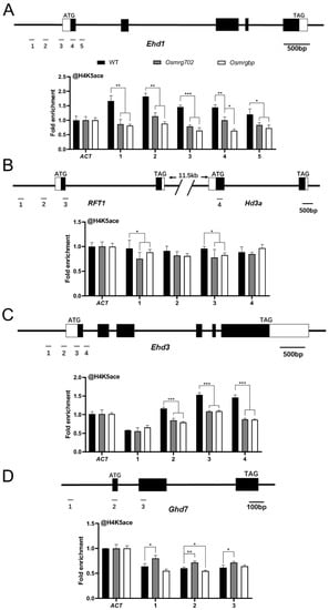 H4K5 acetylation enrichment at the loci of key flowering genes. ChIP-qPCR analysis presenting the enrichment levels of H4K5 acetylation of the Ehd1 (A), RFT1 and Hd3a (B), Ehd3 (C), and Ghd7 (D) loci. The enrichment on the ACT locus was normalized to 1. Asterisks indicate statistically significant differences of Student’s t-test between WT and mutants at the tested locus. * means p < 0.05, ** means p < 0.01, *** means p < 0.001.