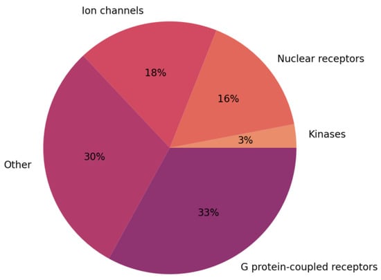 - Santos, R.; Ursu, O.; Gaulton, A.; Bento, A.P.; Donadi, R.S.; Bologa, C.G.; Karlsson, A.; Al-lazikani, B.; Hersey, A.; Oprea, T.I.; et al. A Comprehensive Map of Molecular Drug Targets. Nat. Rev. Drug Discov. 2016, 16, 19–34. [Google Scholar] [CrossRef]