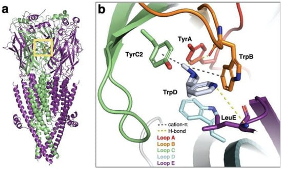 - Thompson, A.J.; Lester, H.A.; Lummis, S.C.R. The Structural Basis of Function in Cys-Loop Receptors. Q. Rev. Biophys. 2010, 43, 449–499. [Google Scholar] [CrossRef] [PubMed]