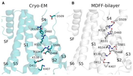 - Jiang, Y.; Ruta, V.; Chen, J.; Lee, A.; Mackinnon, R. The Principle of Gating Charge Movement in a Voltage-Dependent K+ Channel. Nature 2003, 423, 42–48. [Google Scholar] [CrossRef]