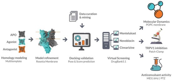 - Llanos, M.A.; Enrique, N.; Sbaraglini, M.L.; Garofalo, F.M.; Talevi, A.; Gavernet, L.; Mart, P. Structure-Based Virtual Screening Identifies Novobiocin, Montelukast, and Cinnarizine as TRPV1 Modulators with Anticonvulsant Activity In Vivo. J. Chem. Inf. Model. 2022, 62, 3008–3022. [Google Scholar] [CrossRef]