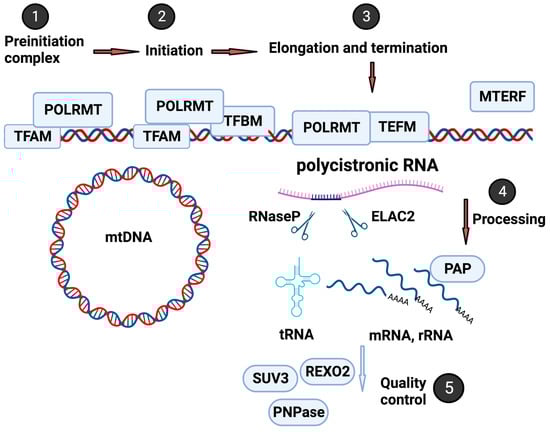 - Jedynak-Slyvka, M.; Jabczynska, A.; Szczesny, R.J. Human Mitochondrial RNA Processing and Modifications: Overview. Int. J. Mol. Sci. 2021, 22, 7999. [Google Scholar] [CrossRef] [PubMed]