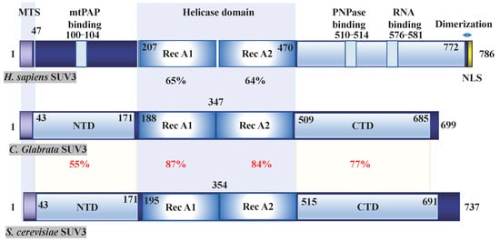 - Stepien, P.P.; Margossian, S.P.; Landsman, D.; Butow, R.A. The yeast nuclear gene suv3 affecting mitochondrial post-transcriptional processes encodes a putative ATP-dependent RNA helicase. Proc. Natl. Acad. Sci. USA 1992, 89, 6813–6817. [Google Scholar] [CrossRef]