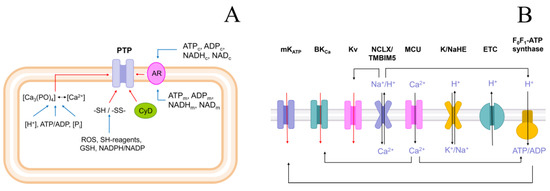 Regulation of PTP (A) and K+ channels in mitochondria (B). Designations: AR, allosteric regulators; CyD, Cyclophilin D; GSH, reduced glutathione; TMBIM5, Ca2+/H+ exchanger; mKATP, ATP-sensitive K+ channel; BKCa, large-conductance calcium-activated potassium channel; Kv, voltage-regulated potassium channel; NCLX, Na+/Ca2+/Li+ exchanger; MCU, mitochondrial Ca2+ uniporter; K/NaHE, K+/H+ exchanger/Na+/H+ exchanger; ETC, electron transport chain.