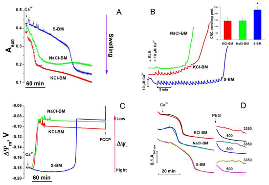 Mitochondrial swelling and the dissipation of ΔΨm can be due to both PTP opening and the electrophoretic influx of cations through the activated cation channels (regardless of their selectivity). To examine the latter possibility, we added 600- and 3350-Da polyethylene glycols (PEGs) to swollen mitochondria and observed either transient or sustainable mitochondrial shrinkage, respectively. These data clearly indicate that the inner mitochondrial membrane (IMM) contains opened pores permeable for solutes of molecular weight higher than 600 but lower than 3350 Da, i.e., the PTP. In accordance with a slower PTP opening, the highest CRC (B) was observed in S-BM (232 ± 26 vs. 144.7 ± 28.6 (KCl-BM) and 146 ± 24.4 nmol∙min−1∙mg prot−1 (NaCl-BM)). Thus, the presence of K+ or Na+ ions in the incubation medium did not postpone but considerably stimulated the PTP opening.