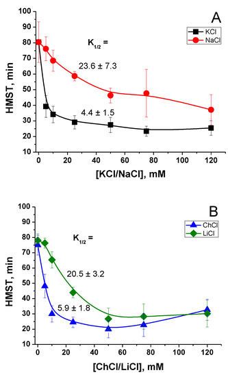 The ionic strength of media may affect the interaction of charged groups of proteins of a PTP complex and membrane phospholipids, thus stimulating the pore opening. We measured the rate of PTP opening in the media containing different concentrations of KCl, NaCl, LiCl, and choline-Cl (ChCl) in S-BM (Figure 3). The final osmolarity of all media was about 300 mOsM, while the ionic strength varied from ~15 mM (S-BM) to 135 mM (maximum concentration of salts). The rate of PTP opening in a mitochondrial suspension was defined as the time required for half-maximal swelling (HMST).