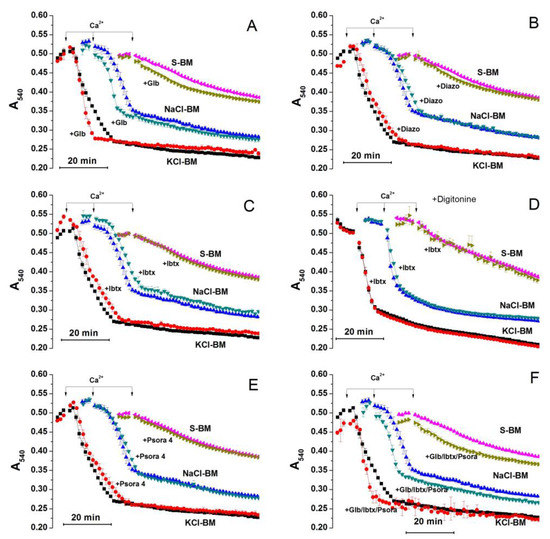 Potassium was the strongest PTP trigger among the cations tested. Thus, we examined the effect of potent and selective modulators of K+ channels on the PTP opening in KCl-, NaCl-, and S-BM. Figure 4 demonstrates the effect of glibenclamide (A), diazoxide (B) (an inhibitor (K1/2 = 0.04–5 μM), and an activator of mKATP channel (K1/2 = 0.5–0.8 μM), respectively [7,72]); the effects of iberiotoxin (C and D) (an inhibitor of BKCa channel, K1/2 ≤ 100 nM [3]), psora 4 (E) (an inhibitor of Kv1.3 channel, K1/2 = 3 nM [73]), and of a combination of the inhibitors (F) are also shown. As psora 4 can also inhibit Kv1.1, Kv1.2, Kv1.4, and Kv1.7 channels, though with lower efficiency, we assessed its effect in the 30–1000-nM range in separate experiments (Supplementary Material Figure S1.) Since a 4-kDa iberiotoxin molecule may be too large to pass through the VDAC channels freely, we examined its effect in mitochondria with both an intact outer membrane (C) and a membrane damaged by 100 µM digitonin [74]. As can be seen, the effect of all modulators and the combination of inhibitors tested were either weak or unspecific for K+ or both (A–F). Thus, the entry of cations into the mitochondria through selective K+ channels seems to have minimum influence on PTP induction.