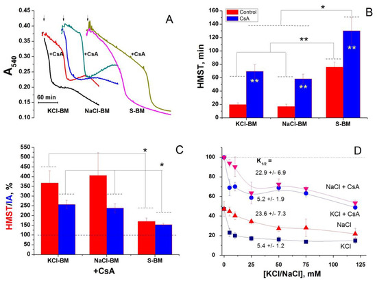 PTP can be in different states of channel conductance and transit from one state to another [28,74,75,76,77,78]. Cyclosporin A (CsA), an inhibitor of CyPD, can constrain both full-conductance PTP opening and transitions between states [74]. We hypothesized that Ca2+ initially transforms the PTP into a K+/Na+-channel and stimulates the inward cation flow, which triggers full PTP opening. If this is true, CsA should decrease the efficiency of PTP triggering by cations. Therefore, we studied the effect of 1 µM CsA on the Ca2+-dependent swelling in K+/Na+-containing media and S-BM (Figure 5). As expected, CsA strongly inhibited Ca2+-dependent swelling both in K+/Na+-containing and cation-free media (Figure 5A), indicating the suppression of the PTP opening. The relative potency of the CsA used to protect the mitochondria was more pronounced in cation-containing media (~300% vs. ~180%) (Figure 5B), which could support our hypothesis. However, the absolute increment in HMST and integrated amplitude of absorbance (IA) was similar in all media (Figure 5C). The presence of CsA in the incubation media had a minor effect on the relative capability of KCl and NaCl to stimulate the PTP opening: the K1/2 for the salts was 5.2 ± 1.9 and 22.9 ± 6.9 mM, respectively (Figure 5D). These things considered, CsA was almost equally efficient in protecting the mitochondria in the media of different salt concentrations. These data indicate that the removal of cations and the suppression of CyPD additively contribute to PTP inhibition.