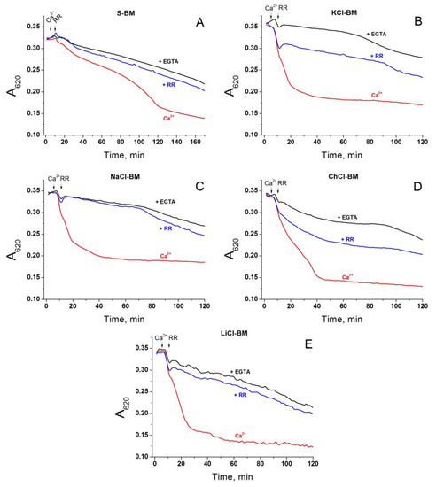 Effect of RR on the rate of PTP opening in Ca2+-loaded mitochondria in S- (A), KCl- (B), NaCl- (C), ChCl- (D), and LiCl-based medium (E). Two minutes before measurements, mitochondria (0.75 mg protein/mL) were placed in the corresponding incubation media supplemented with 5 mM glutamate plus 5 mM malate (Trizma salts) and 10 µM EGTA. Just before measurements, the suspensions were placed in the wells of 96-well plates, which, where shown, contained 1 mM EGTA (+EGTA). Arrows indicate the addition of 20 µM Ca2+ (final concentrations) and 1 µM RR. Representative traces of one experiment of three that are similar are presented. The points of the curves are the means of three technical replicates.