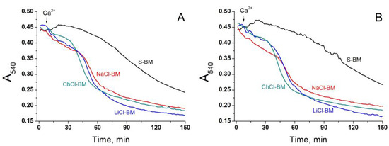 The pH of incubation media is an efficient regulator of the activity of all H+/OH−-dependent symporters and antiporters [83,90,91,92]. More acidic external pH stimulates the extrusion of cations and entry of anions, e.g., of Pi and glutamate. Therefore, if exchanger-mediated cation entry into the matrix is essential for the triggering of the PTP, the latter will open more readily at an alkaline external pH. Conversely, if the PTP opening is activated by the entry of anions, the acidic external pH will stimulate the pore opening. The data presented in Figure 11 shows that in all media tested, namely S- (A), KCl- (B), NaCl- (C), ChCl- (D), and LiCl-BM (E), the Ca2+-dependent PTP opening occurred most rapidly at pH 6.8 and most slowly at pH 7.6. Hence, conditions that hamper the cation entry through any H+-dependent antiporter but promote the acidification of the matrix via the antiporters, or Pi and glutamate carriers, strongly stimulate PTP opening [92]. Further, at all the pH levels tested, the swelling was faster in cation-containing media than in sucrose. One can conclude that the decrease in the matrix pH but not the exchanger-dependent entry of cations underlies the effect of external pH on the rate of PTP opening.