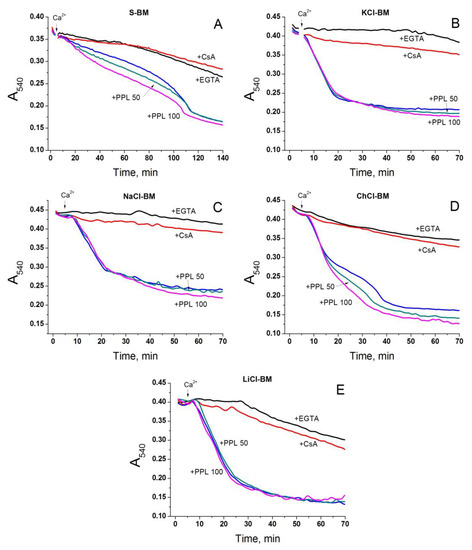One may suggest that PTP opening is triggered by chloride anions, not cations. In order to address this possibility, we studied the effect of potent inhibitors of the Inner Membrane Anion Channel (IMAC), namely propranolol (IC50 ~ 25 µM) and Ro5-4864 (IC50 ~34 µM), on the Ca2+-dependent swelling in different media (Figure 8, Supplementary Material Figure S2) [80]. Propranolol (50 and 100 µM) (+PPL) clearly stimulated PTP-dependent swelling in S- and ChCl-BM (A and D) but had a minimal effect when in KCl-, NaCl-, and LiCl-BM (B, C, and E). Ro5-4864 (Ro) in 75 and 150 µM concentrations caused a dose-dependent stimulation of the swelling, even before the Ca2+ addition to all media tested (Supplementary Material Figure S2). These data do not confirm the importance of the entry of anions into the matrix through the IMAC for the stimulation of PTP opening. The activation of swelling may reflect the unspecific effects of the inhibitors on the system of volume regulation.