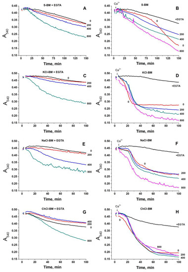 Effect of quinidine on Ca2+-dependent and -independent mitochondrial swelling in KCl-, NaCl-, ChCl- and S-BM. Two minutes before measurements, mitochondria (0.75 mg protein/mL) were placed in the incubation media supplemented with 5 mM glutamate plus 5 mM malate (Trizma salts), 10 µM EGTA, and indicated concentrations (µM) of quinidine. Where shown, the media contained 1 mM EGTA (+EGTA) instead of the standard 10 µM concentration. Five minutes after the start of recordings, 20 µM Ca2+ was added to the samples with standard EGTA. Incubation media are S-BM (A,B), KCl-BM (C,D), NaCl-BM (E,F), and ChCl-BM (G,H). Traces of one representative experiment of three that are similar are presented. The points of the curves are the means of three technical replicates. Arrows show the addition of 20 µM Ca2+ (final concentrations).