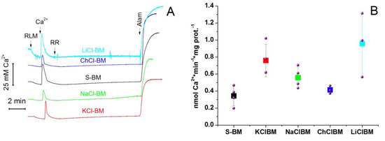The inhibition of PTP opening by RR is most likely due to the Ca2+ extrusion via the Ca2+/H+ (cation) exchanger(s) when the Ca2+ influx via MCU is blocked (Figure 6 and Figure 7). One could expect that the rate of Ca2+ extrusion should inversely correlate with the rate of PTP opening. In order to address this issue, we measured the rate of the release of accumulated Ca2+ by mitochondria treated with RR in different incubation media (Figure 10). The release of Ca2+ was measured using a Ca2+-selective electrode. The media contained 1 µM CsA in order to inhibit PTP opening. At the end of each recording, alamethicin (Alam) was added to the medium to assess the total amount of Ca2+ accumulated by mitochondria. Figure 10 shows that the presence of salts in the medium did not reduce the rate of Ca2+ extrusion from mitochondria. On the contrary, the minimum rate of Ca2+ release was observed in S-BM. In ChCl-BM it was almost the same as in S-BM. In other media, it was approximately 2.0 (KCl-BM), 1.6 (NaCl-BM), and 2.7 times higher (LiCl-BM) than in S-BM. Thus, the rate of Ca2+ release in various media is not the main factor that determines the sensitivity of mitochondria to PTP induction in the presence of salts.