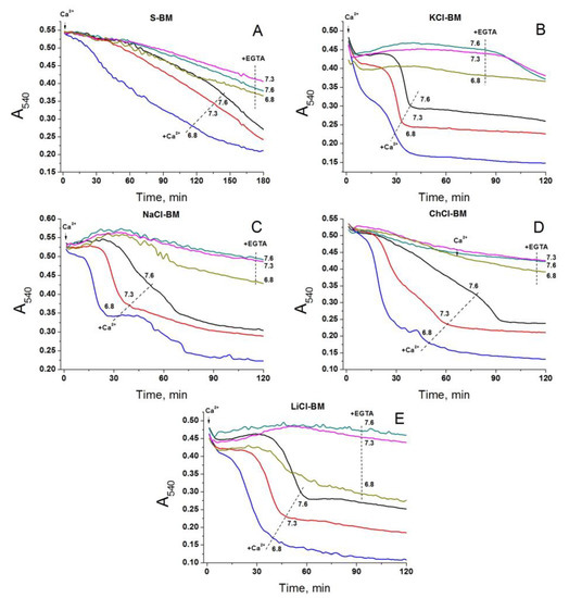 Effect of the pH of S- (A), KCl- (B), NaCl- (C), ChCl- (D), and LiCl-BM (E) on the rate of Ca2+-dependent PTP opening. Two minutes before measurements, mitochondria (0.75 mg protein/mL) were placed in the corresponding incubation media (pH 7.6) supplemented with 5 mM glutamate plus 5 mM malate (Trizma salts) and 10 µM EGTA. Just before measurements, the suspensions were placed in the wells of 96-well plates, which, where shown, contained 1 mM EGTA (+EGTA), 20 µM Ca2+ (final concentrations), and 1.05 (pH 7.3) or 2.4 µL/100 µL (pH 6.8) of 400 mM HCl. Figures at traces show the pH of the media. Representative traces of two experiments of four that are similar are presented. The points of the curves are the means of three technical replicates. Arrows show the addition of 20 µM Ca2+ (final concentrations).