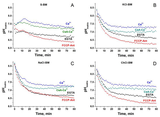 The pH of the mitochondrial matrix is a strong regulator of the PTP, which can modulate the degree of protonation of critical amino acid residues that regulate the PTP [93], the stability of Ca2+-Pi complexes [30], and the rate of transport of Pi and substrates. We assumed that cations in the media change the matrix pH in a way of facilitating the PTP opening. Therefore, we measured matrix pH in mitochondria incubated in S-, KCl-, NaCl-, and ChCl-BM in the presence and absence of Ca2+, the inhibitor of the respiratory chain antimycin, and an uncoupler (Figure 12).
