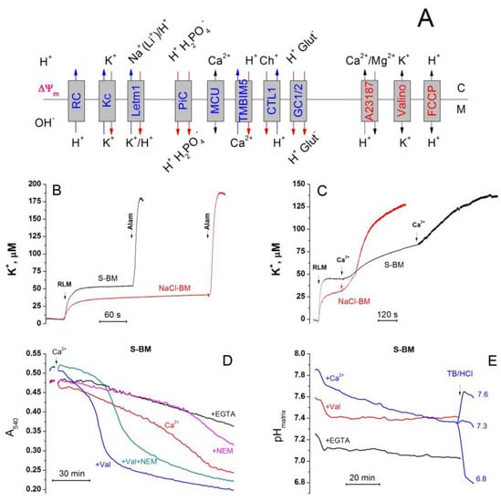 Cations regulate the activity of the K+/H+ exchanger, matrix pH, and Pi influx. (A). Transporters, exchangers, and ionophores capable of regulating cation and anion fluxes and matrix pH. Designations: RC, respiratory chain; Kc, K+ channel; Letm1, K+(Na+, Li+)/H+ exchanger; TMBIM5, Ca2+/H+ exchanger; CTL1, choline transporter-like protein 1; GC1/2, glutamate carriers 1 and 2; Valino, valinomycin. B and C. K+ efflux from mitochondria in NaCl-BM and S-BM. Incubation media contained 5 mM glutamate plus 5 mM malate (Trizma salts) and 10 µM EGTA. Arrows show the additions of RLM (1 mg protein/mL), 40 µg/mL Alam (B), and 50 µM Ca2+ (C). Standard traces of one representative experiment of three that are similar are presented. (D,E) The impact of valinomycin and N-ethylmaleimide on PTP opening and matrix pH of RLM in S-BM. Two minutes before measurements, mitochondria (0.75 mg protein/mL) (D) and mitochondria (0.75 mg protein/mL) pre-loaded with BCECF-AM € were placed in the S-BM supplemented with 5 mM glutamate plus 5 mM malate (Trizma salts), and 10 µM EGTA. Just before measurements, the suspensions were placed in the wells of 96-well plates which, where shown, contained 1 mM EGTA (+EGTA), 50 ng/mL valinomycin (+Val), 10 μM NEM (+NEM), and 300 µM Ca2+ (+Ca2+). Arrows indicate the addition of 20 µM Ca2+ (D) and 3 mM Trisma base (TB) or 5.8 mM HCl to reach the pH of media of 7.6 and 6.8, respectively €(E). Representative traces of one experiment of three that are similar are presented. The points of the curves are the means of three technical replicates.