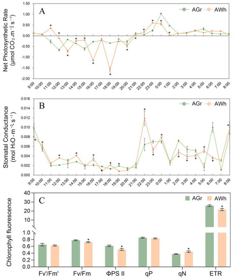 To examine the differences in photosynthetic ability between GrCs and WhCs, a photosynthesis-measuring device (LI-6400, LI-COR Co., Ltd., Lincoln, Nebraska, America) was used in this assay. GrCs and WhCs were placed in the device with a natural light source and stable CO2 flow rate at 500 μmol·s−1. Data of NPR (μmolCO2·m−2·s−1) and SCT (molH2O·m−2·s−1) were recorded every 30 min from 9:00 to 8:30 next day. Indices of chlorophyll fluorescence were measured using a Handy FluorCam 1000-H (Photon System Instruments, Brno, Morava, Czech Republic), and calculation followed a previous method [52].